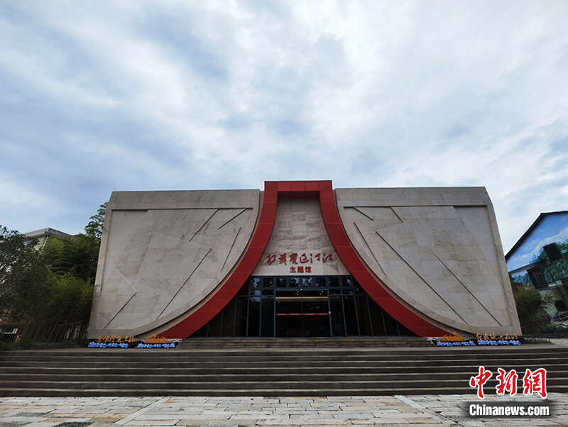 在当年摆渡人们行舟悠游来去的渡口旁,一栋造型奇特的建筑映入采访团的眼帘——展馆整体结构形如“四”字,寓意“红四军”,中间红色砌砖组成“八一”字样,九面旗帜浮雕象征九条船载着红军渡江。
