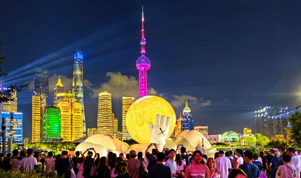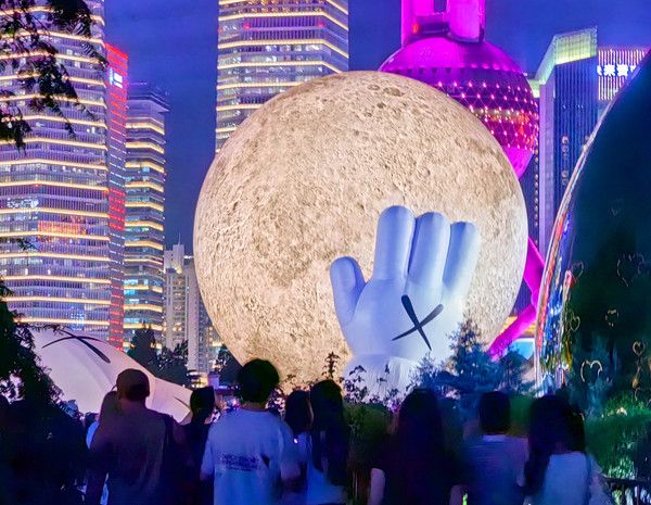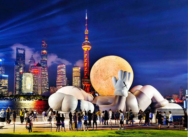 2024年8月29日,上海,著名艺术家KAWS和其长期合作伙伴All Rights Reserved在北外滩国客中心码头呈献其标志性角色COMPANION的装置艺术品——一个悠闲静卧、怀中抱月、仰望天空的大型充气装置艺术品。适逢中秋佳节将至,这个充满创意的超级“大月亮”给申城增添了一道靓丽的风景。