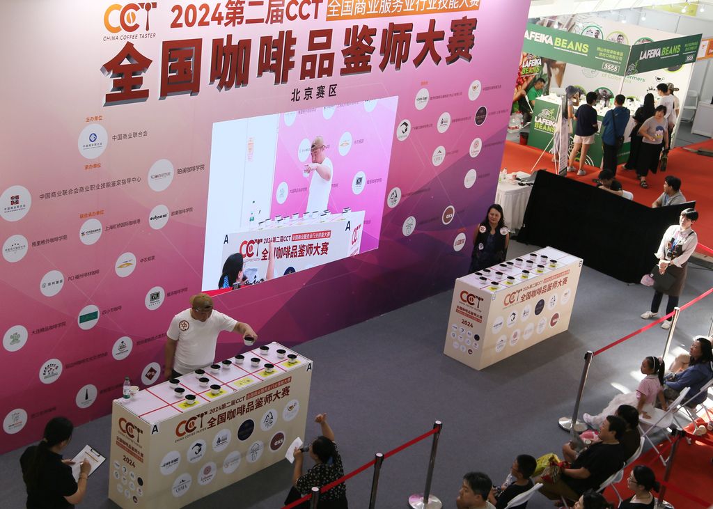 2024年8月30日,北京,为期三天的2024中国国际咖啡展览会在中国国际展览中心开幕。国咖啡品鉴大赛现场,一位参赛选手在品鉴咖啡。