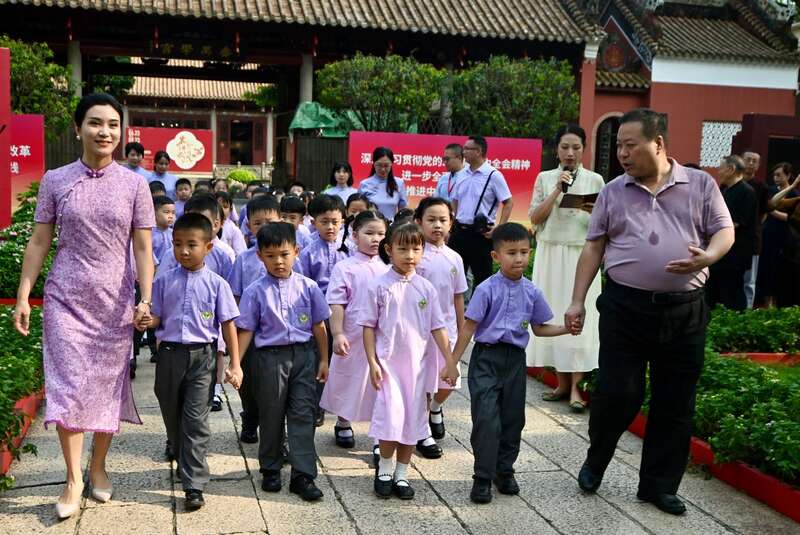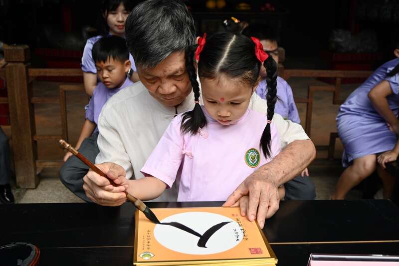 中国青年报客户端讯(谢东霖 中青报·中青网记者 林洁)8月30日,在广州农讲所纪念馆番禺学宫,2024年广州市越秀区的小学一年级入学新生开笔礼举行。今年开学季,广州市越秀区逾1.4万名一年级入学新生参加各自学校的开笔礼活动。