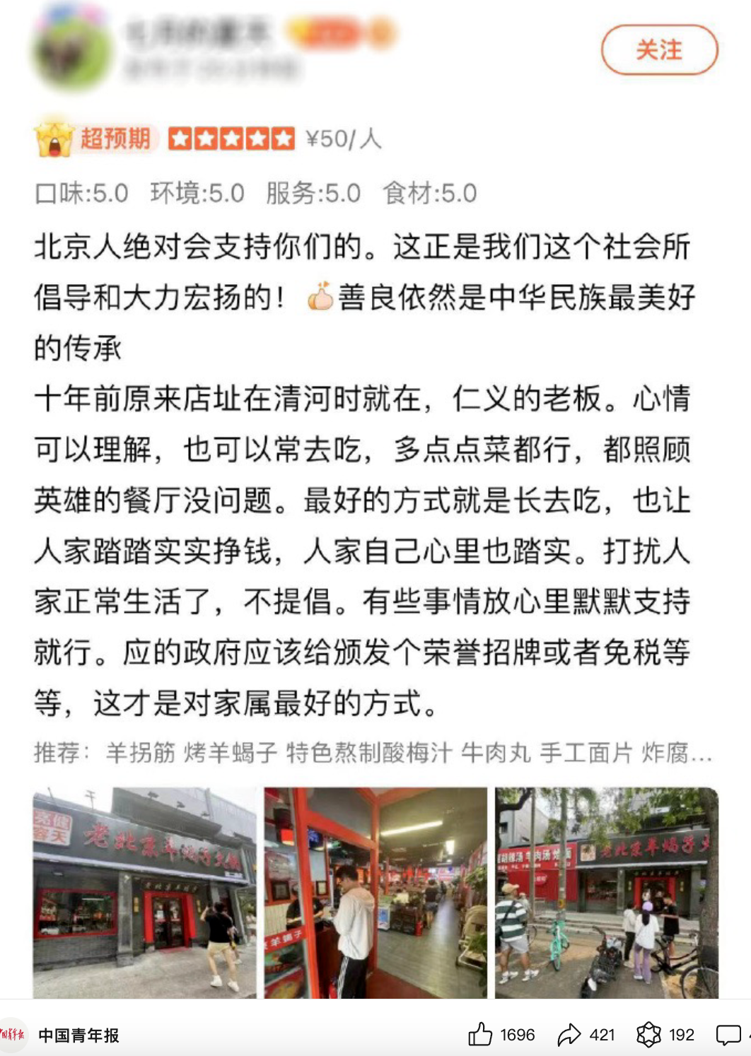 很多客人都是听说了栾留伟的事迹后专程赶来的,既向英雄表达敬意,也通过这种方式帮衬店里的生意。
