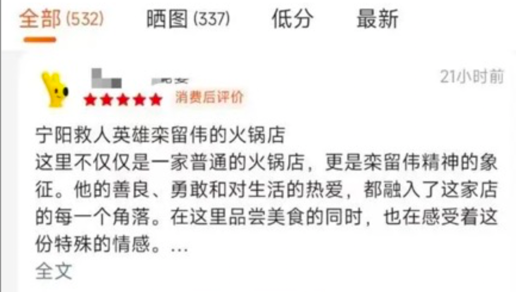 据报道,山东泰安41岁的栾留伟救人事迹传开后,他生前在北京开的火锅店排起长队。