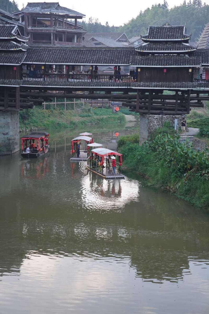 侗寨跨水而建。进入程阳八寨,首先要走过今年迎来100岁生日的程阳永济桥。此桥是楼阁式建筑,整座桥梁搭建时不用一钉一铆,主要由木料和石料建成,桥长近80米,宽近4米,高近12米,是我国建筑艺术中的珍品。
