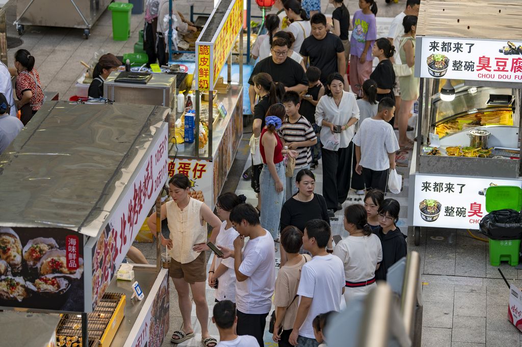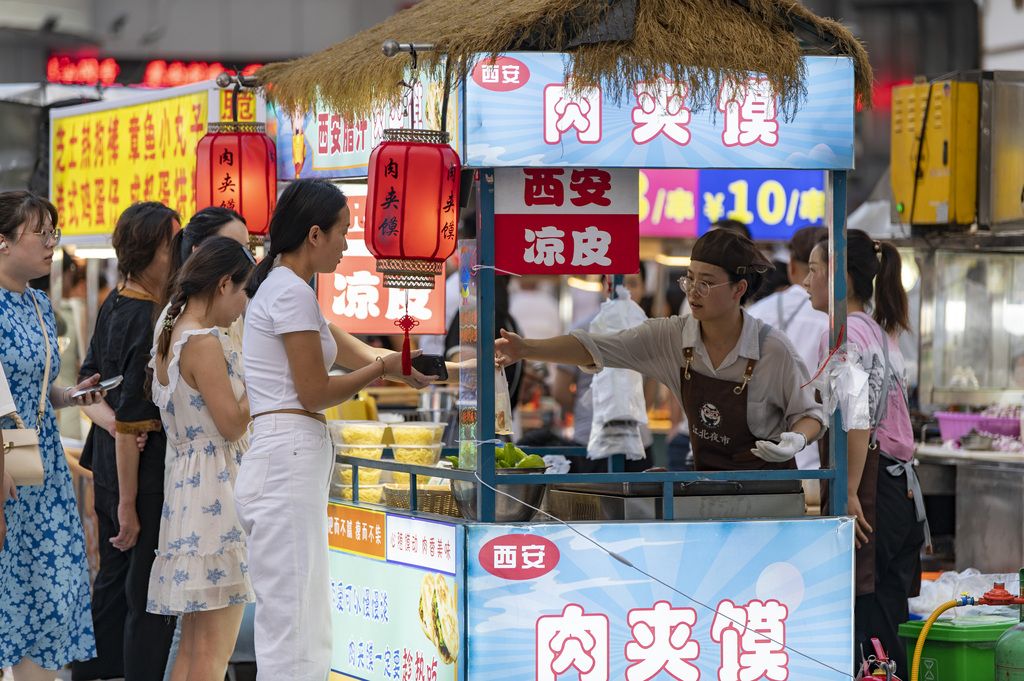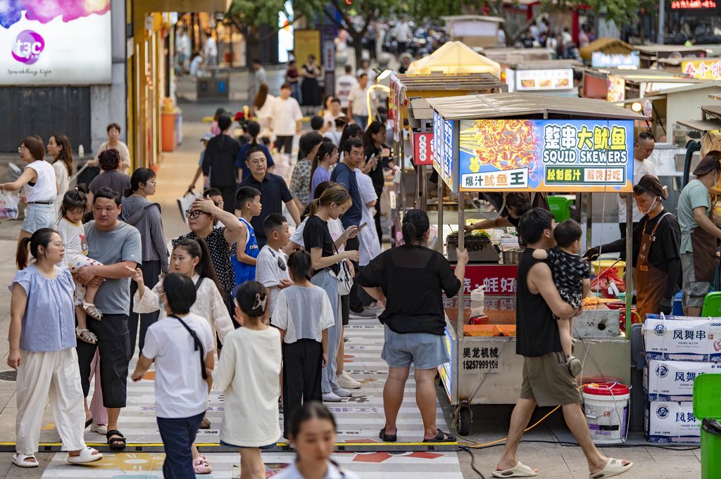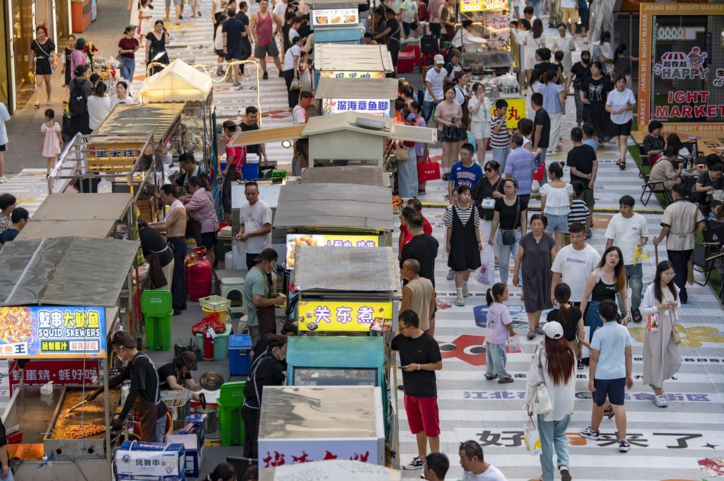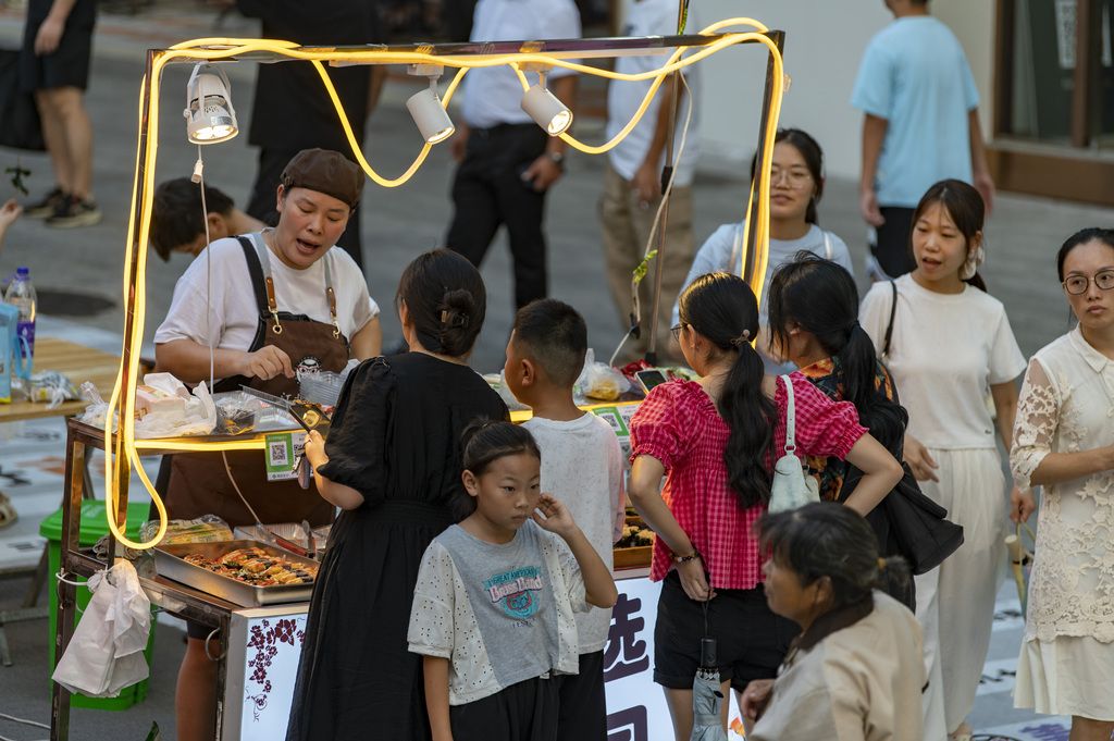 2024年8月30日傍晚,在浙江省金华市婺城区江北夜市美食街区,各种美食吸引市民和游客前来品尝。