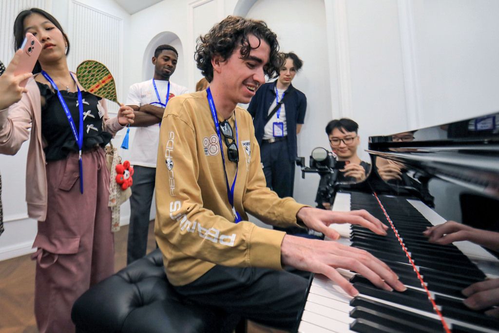 2024年8月30日,四川成都,来自美国的Camden Thomas Beckstrand在成都音乐产业中心录音棚里弹奏钢琴。当日,来自美国、德国、泰国、赞比亚等13个国家的青年在四川成都参加“唱歌学中文——唱行成都”研学营,在城市中行走,感受沉浸式音乐体验之旅。 中新社记者 王磊 摄