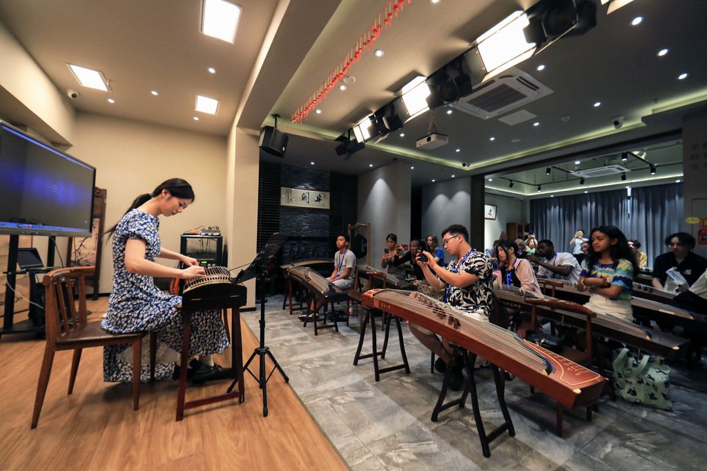 2024年8月30日,四川成都,外国青年在学习古筝演奏。当日,来自美国、德国、泰国、赞比亚等13个国家的青年在四川成都参加“唱歌学中文——唱行成都”研学营,在城市中行走,感受沉浸式音乐体验之旅。 中新社记者 王磊 摄