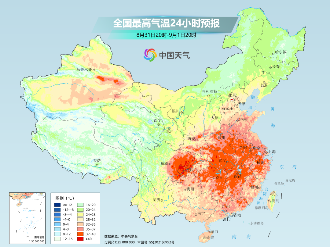 预计明天,高温范围和强度将继续扩大、增强,黄淮到华南大片区域最高气温将达到35℃以上,其中四川东部、重庆、广西北部及江南北部、江汉、江淮东部等地将出现37℃以上高温天气,局地可达40℃以上。