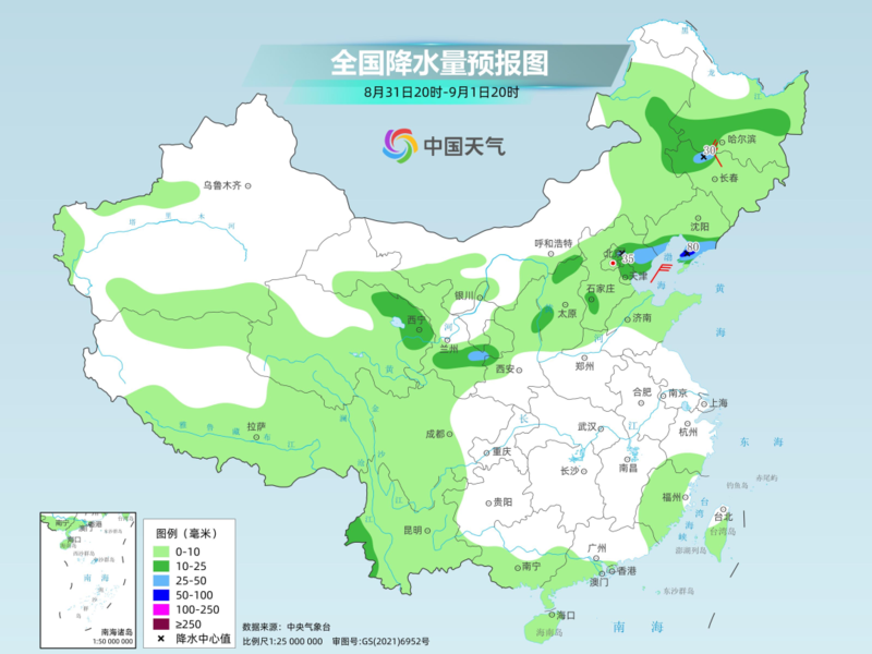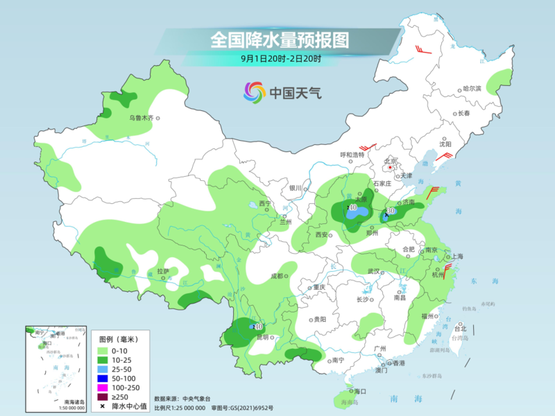 9月2日至4日,西北地区东部、华北北部、东北等地自西向东还将先后有小到中雨或阵雨过程,局地有大雨或暴雨。