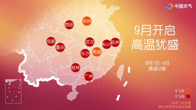 9月2日至3日,黄淮、江淮、江南东部高温逐渐消减,之后9月4日至5日高温又会向东扩张。预计未来10天,四川盆地、江汉、江南、华南等地高温日数将有5~10天,其中四川、重庆、湖北、湖南、江西、浙江等部分地区最高气温可达40~43℃。