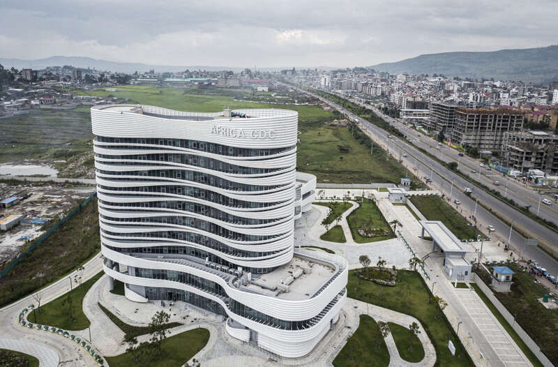 这是2023年9月10日在埃塞俄比亚首都亚的斯亚贝巴拍摄的非洲疾控中心总部大楼(无人机照片)。中国援非盟非洲疾病预防控制中心总部(一期)项目于2023年1月竣工,这是非洲大陆第一个拥有现代化办公和实验条件、设施完善的全非疾控中心。