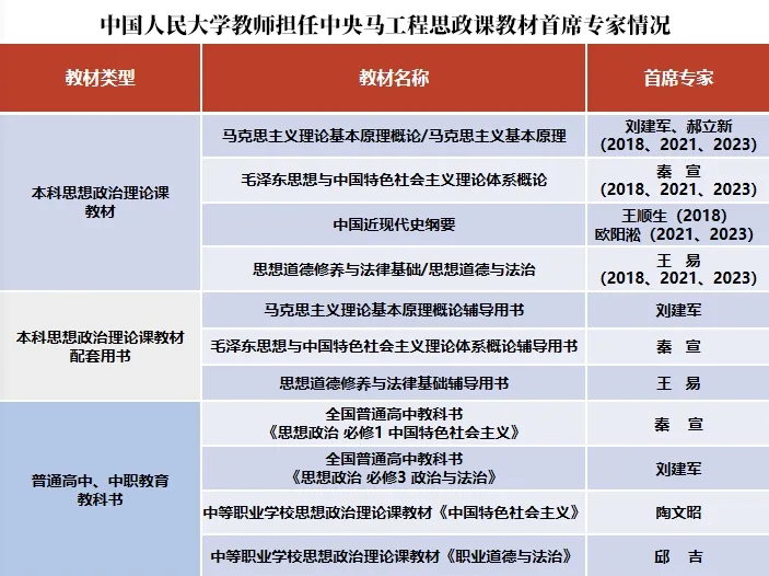 以“同题共答”引领“同课异构”,推动从“散兵作战模式”向“集团军作战模式”转变。中国人民大学多位教师担任中央马克思主义理论研究和建设工程重点教材首席专家和主要成员。多位教师主编或参加习近平新时代中国特色社会主义思想全学段学生读本编写。打造大中小学思政课一体化建设“金课”体系,重点推出“习近平新时代中国特色社会主义思想概论”和“思想道德与法治”示范课。