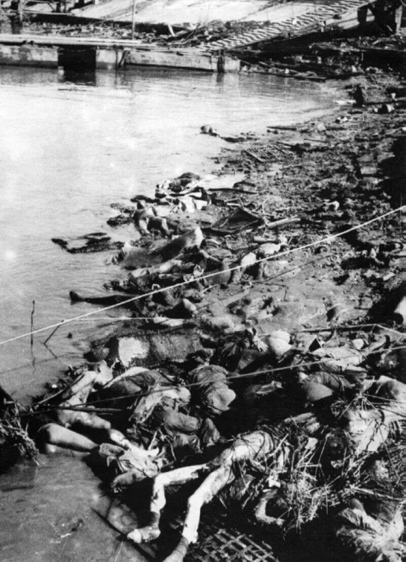 图为被日军屠杀的南京市民尸体堆满河岸。