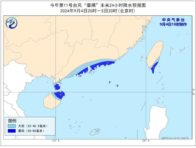 降水预报:9月4日20时至5日20时, 台湾岛东南部、广东南部沿海、海南岛东北部等地将有大到暴雨(50-80毫米)。