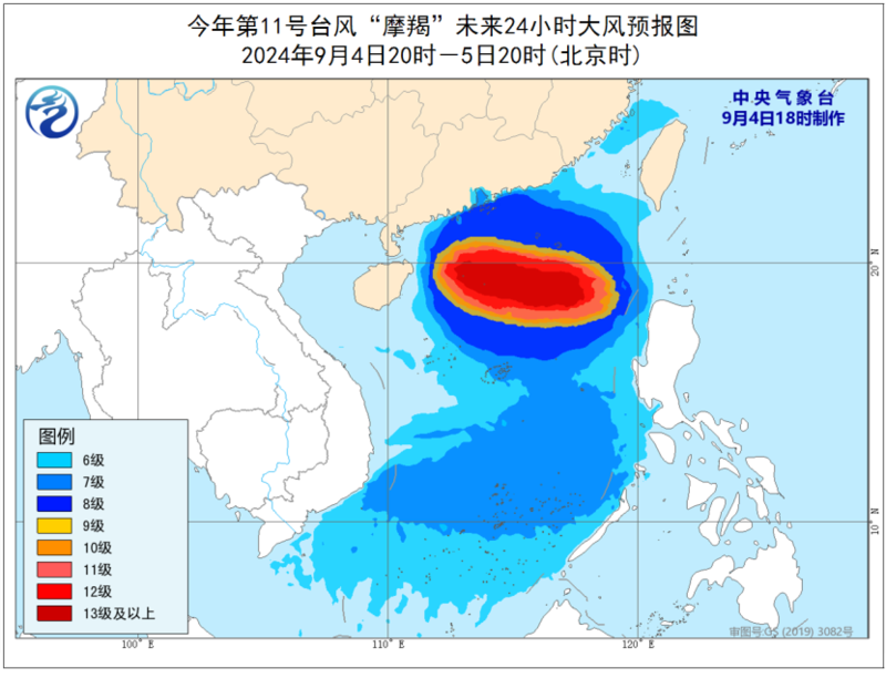 大风预报:9月4日20时至5日20时,台湾海峡、南海大部、巴士海峡、福建中南部沿海、广东中东部沿海将有6-8级大风,其中南海北部和中部部分海域及东沙群岛附近海域将有9-11级大风,“摩羯”中心经过的附近海域的风力可达12-16级、阵风17级以上。