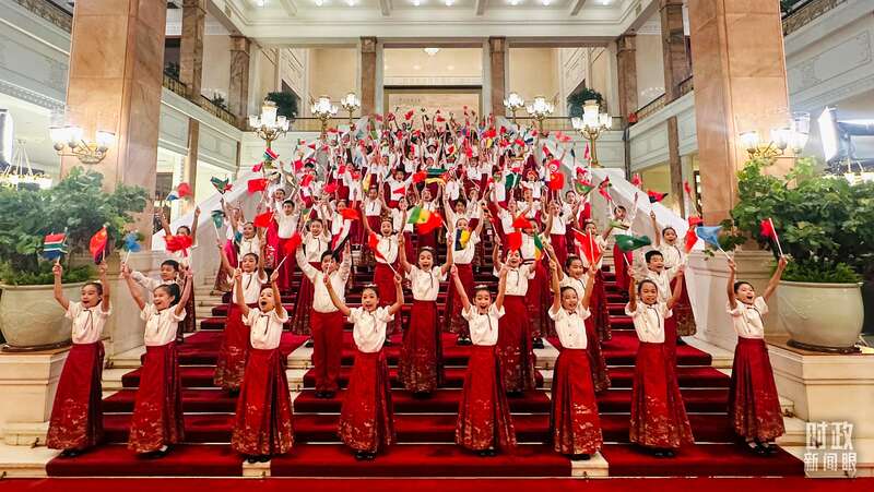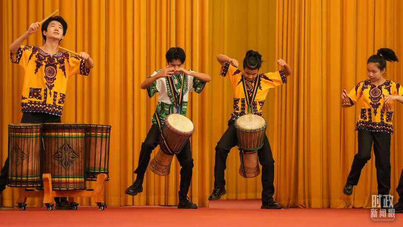 在前往宴会厅沿途,身着中国民族服装和非洲特色服装的青少年,打起欢快的非洲鼓,载歌载舞欢迎远道而来的贵宾。