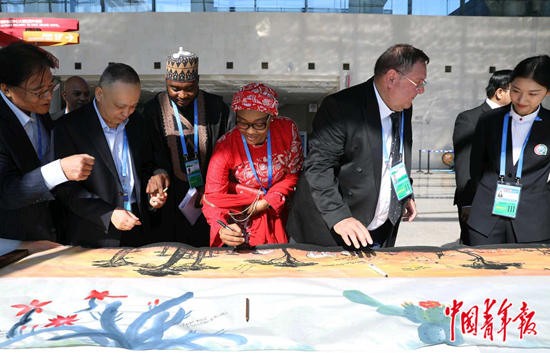 9月6日,北京,国家会议中心,第八届中非企业家大会开始前,部分参会代表共绘以“非洲草原”为主题的中国国画。当日,第八届中非企业家大会在这里举行,相关国家的领导人及中非企业家代表、相关国际组织和机构代表约1000人参加了大会,深入探讨拓展中非经贸领域合作。中非企业家大会自2003年成立以来,已经成功举办7届,是中非合作论坛框架下中非工商界最高级别的经贸盛会,也是中非双方进一步拓展经贸领域合作、推动中非经贸关系全面发展的重要机制性平台。中青报·中青网记者 陈剑/摄