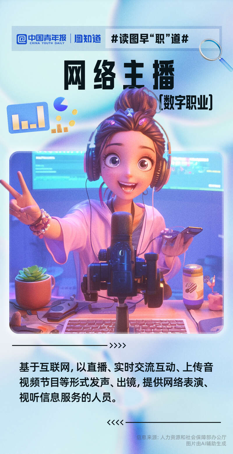 近日,人力资源和社会保障部等部门发布了19个新职业信息。今天,我们来认识其中的网络主播,其主要职责是基于互联网,以直播、实时交流互动、上传音视频节目等形式发声、出镜,提供网络表演、视听信息服务。《中国网络视听发展研究报告(2024)》显示,截至2023年底,中国已有1508万名职业网络主播。此次网络主播职业的正式认定对于网络直播行业的规范化和专业化发展提供了强大助力,也为以网络主播为代表的数字化职业提供更多就业机会。