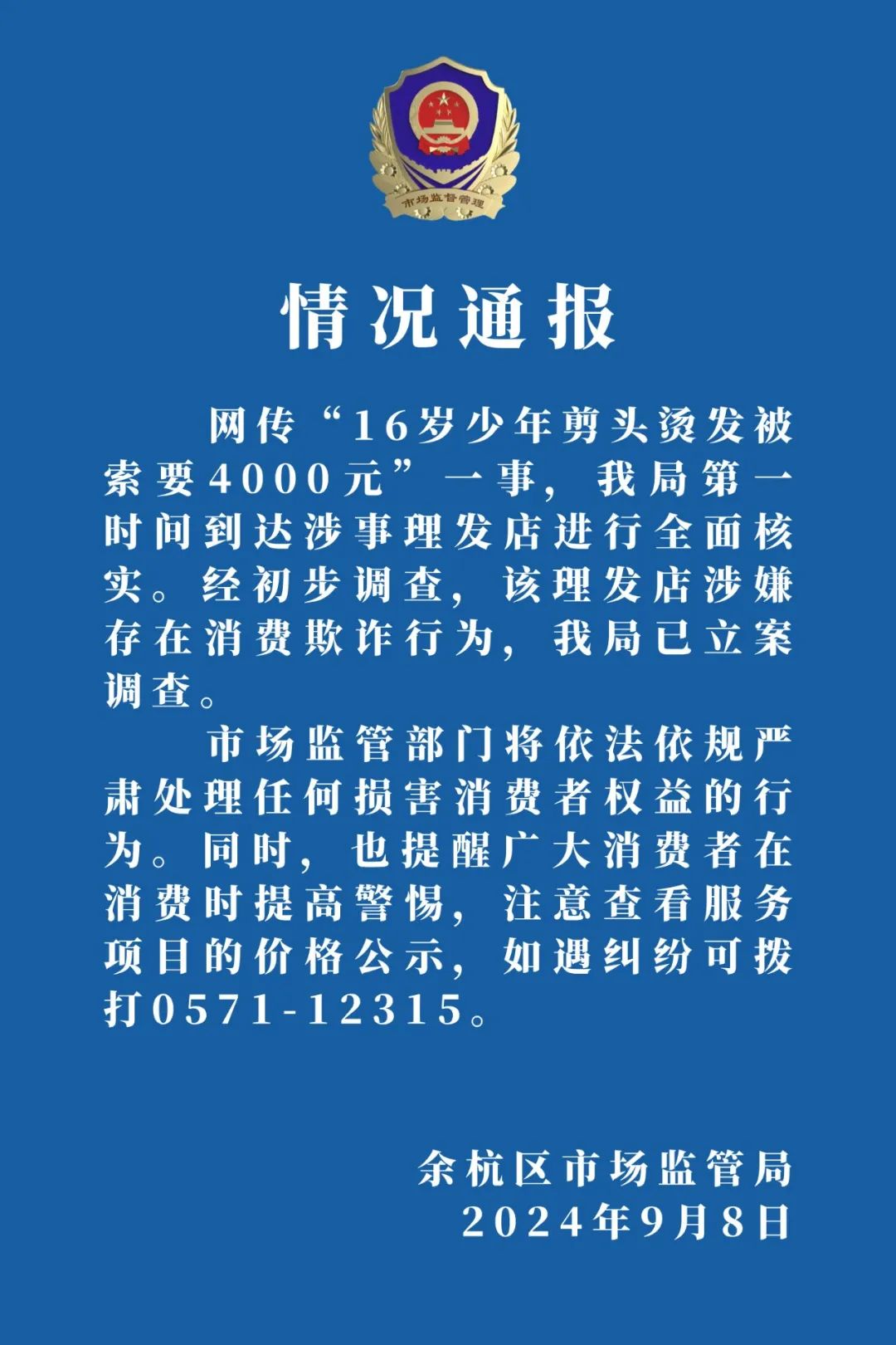 9月8日,浙江杭州余杭区市场监管局通报“16岁少年剪头烫发被索要4000元”:理发店涉嫌消费欺诈,已立案。