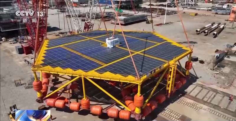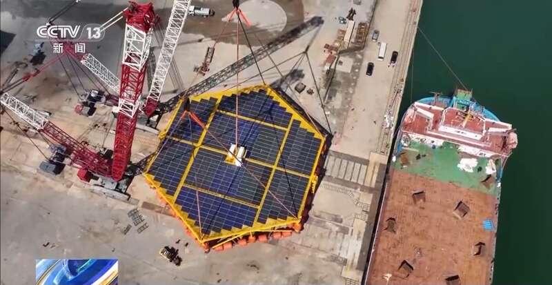 总台央视记者 古峻岭:在我国首套抗浪型漂浮式光伏平台——“黄海一号”的装船现场,我们可以看到,此刻重量超过360吨的平台,正在被巨大的吊臂缓缓吊离地面。工作人员告诉我,吊装将持续一个多小时。之后,它将被完整地平移到码头边的运输船上运往离岸距离30公里,水深超过30米的海上风电场开始后续的海上光伏实证数据采集分析等研究工作。