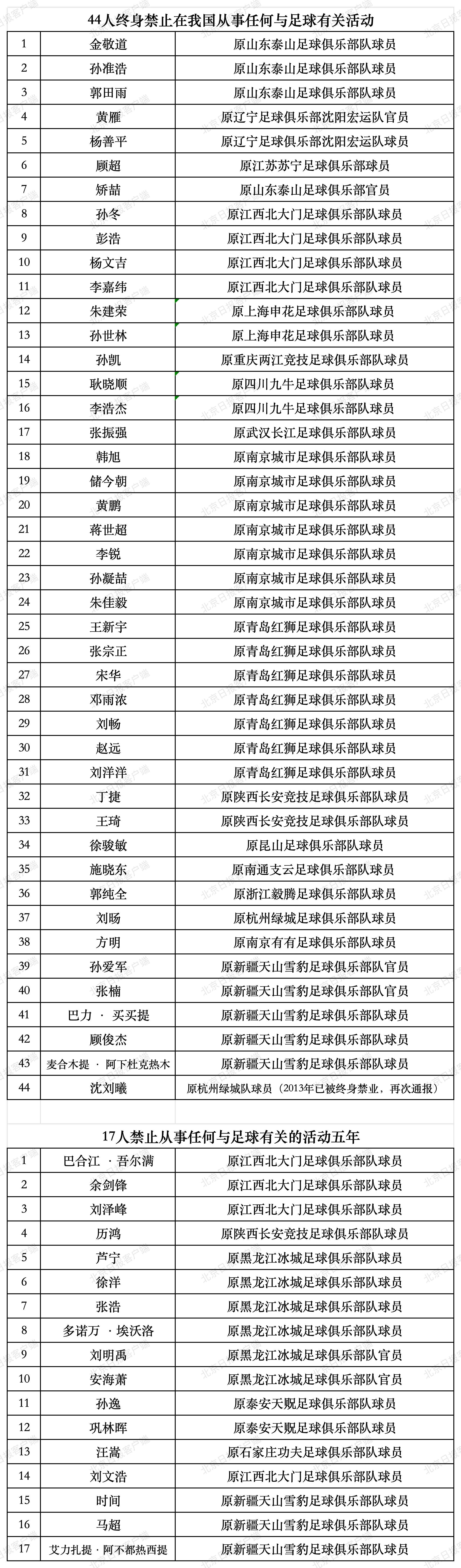 一、给予金敬道等43人终身禁止在我国从事任何与足球有关活动的处罚;