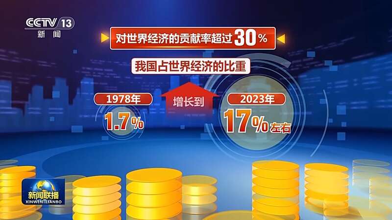 我国占世界经济的比重,从有数据统计以来的1978年的1.7%,增长到2023年的17%左右,对世界经济的贡献率超过30%。