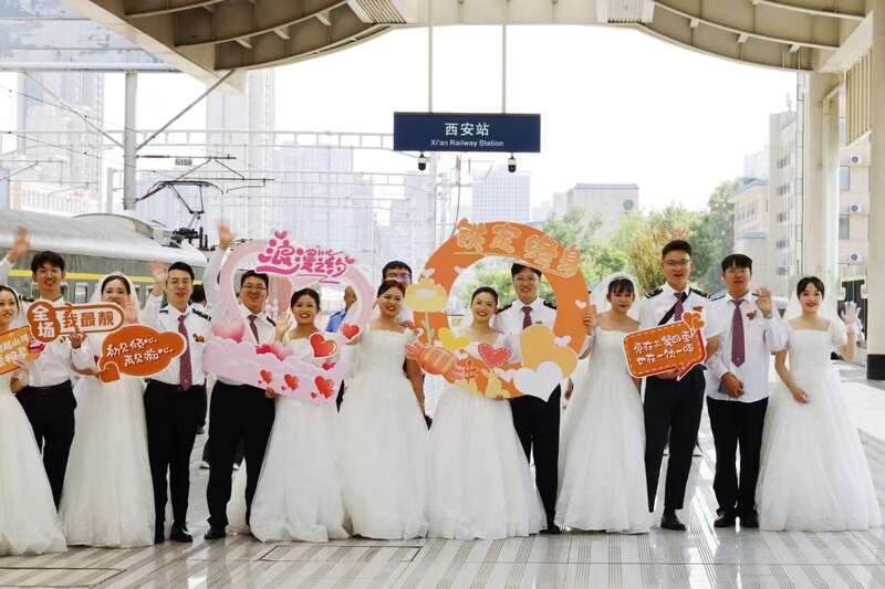 典礼结束后,100对新人还搭乘中国铁路西安局集团有限公司开行的“幸福号”旅游列车参加爱情互动游戏,观看精彩文艺节目,并走进西铁职工培训基地,“打卡”铁路蒸汽机车展,体验铁路机车模拟驾驶,参观陕西铁路陈列馆,感受新中国成立75周年来的中国铁路发展变迁。
