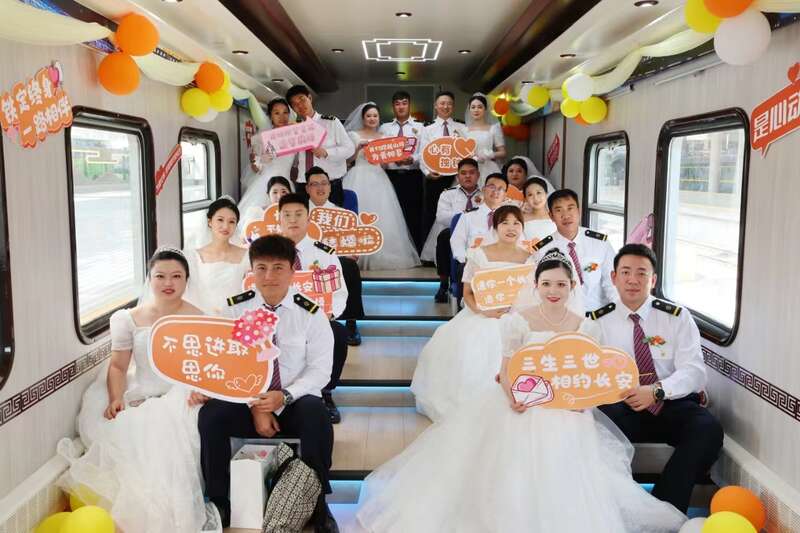 新人们在“幸福号”旅游列车上合影留念。刘翔/摄