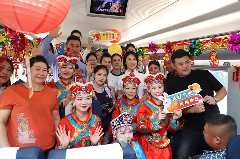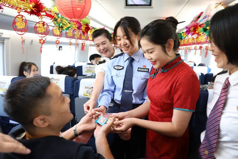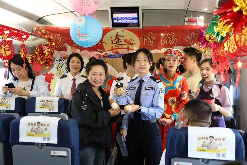2024年9月13日,辽宁沈阳,沈阳铁路公安局沈阳公安处乘警支队民警与乘客一起迎接中秋佳节。在中秋佳节来临之际,沈阳铁路公安局沈阳公安处乘警支队与在中国铁路沈阳局集团有限公司沈阳客运段动车三队,在值乘的沈阳南开往北京朝阳的G980次高铁列车上,携手举办“情满中秋”欢庆活动,与乘客们一起迎接中秋佳节。 期间,沈阳乘警支队民警还以寓教于乐的方式,向大家宣传讲解网络安全知识和反诈常识,以及列车安全提示,与旅客热情互动,赠送警察小熊玩偶,为旅客安全乘车保驾护航。