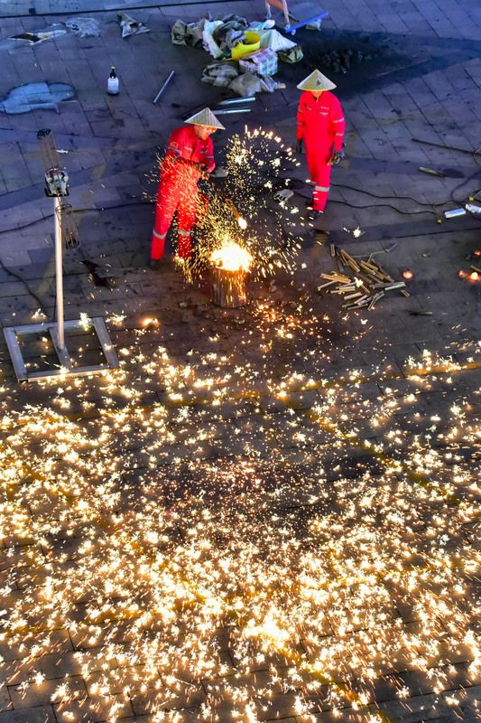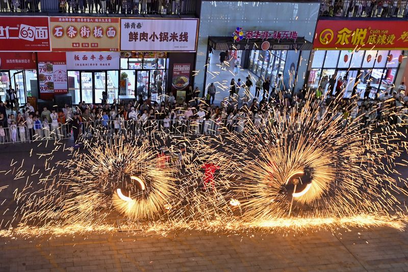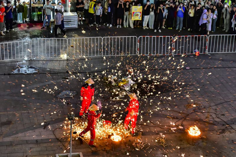 当日,一场非遗打铁花展演在山东省青州市泰华城举办,为即将到来的中秋佳节营造了浓浓喜庆气氛。