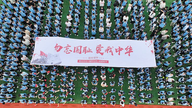 2024年9月18日,江苏省连云港市灌云县第一中学,该县检察院检察官在校园组织开展“九一八”爱国主义教育活动,缅怀抗战英烈,让学生树立为国争光的雄心壮志。