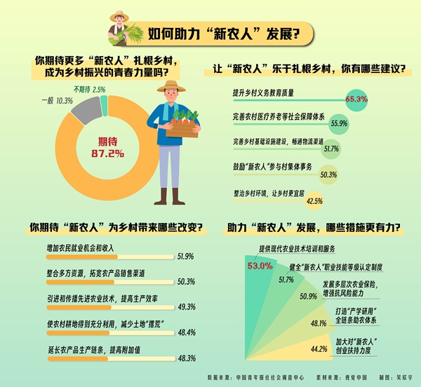调查显示,87.2%的受访青年期待更多“新农人”扎根乡村,成为乡村振兴的青春力量。