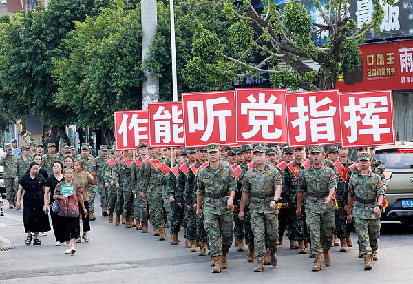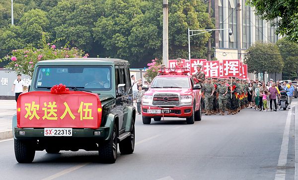 2024年9月20日,四川广安,华蓥市组织的2024年入伍新兵,在参加当地在学校举行的欢送仪式。当日,四川省华蓥市通过组织入伍新兵绕城巡游到高中学校举行欢送大会的方式,为即将踏入军营的新兵鼓气壮行,进一步增强入伍新兵的自豪感、荣誉感和使命感,同时进一步强化青少年学生的国防责任感,从小树立保家卫国的使命感。