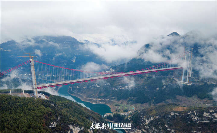 花江峡谷大桥主桥跨径1420米,桥面到水面的高度达625米。目前,大桥已完成主缆索股架设,正有序进行索夹吊索安装及钢桁梁组装施工,总体进度达70%。建成后,花江峡谷大桥不仅主桥跨径居山区桥梁跨径世界第一,也将成为新的山区峡谷世界第一高桥。