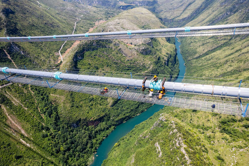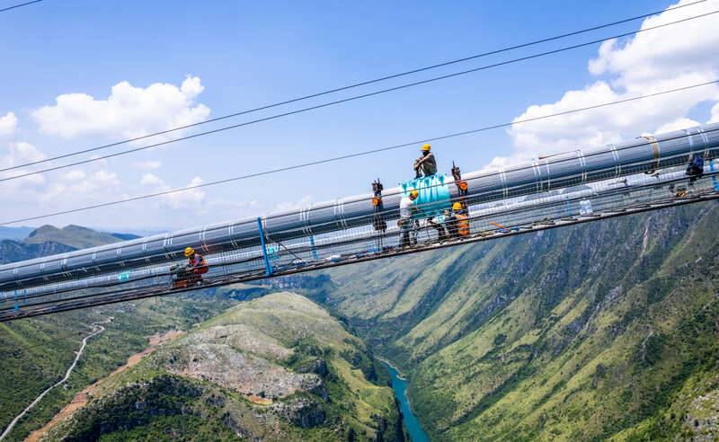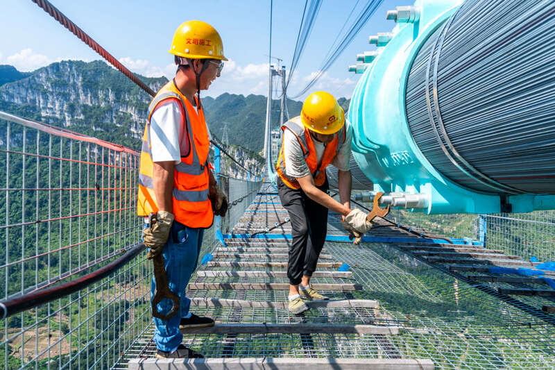 建筑工人们工作在距离谷底江面700多米高的猫道上,云雾似乎触手可及。他们与风雨为伴,与日月同舟,日以继夜奋战在大桥建设第一线,只为让大桥保质保量按时竣工,并在这个即将刷新的世界纪录上书写属于自己的一笔。