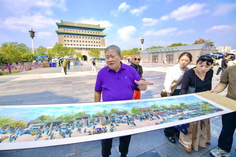 观光巴士从正阳门箭楼附近出发,伴随着观光巴士“铛铛”的铃声、“京城叫卖大王”的吆喝声,前门外王致和南酱园旧址、慈禧赐名臭豆腐“青方”、大阿哥叫卖臭豆腐等传奇故事,在京味儿画家杨信的画作和讲述中一幕幕展开。