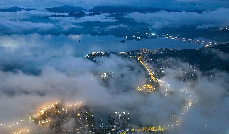 2024年9月19日,杭州,受台风“普拉桑”影响,淳安县千岛湖镇风起云涌,云卷云舒,千岛湖上空烟雨缥缈。