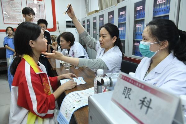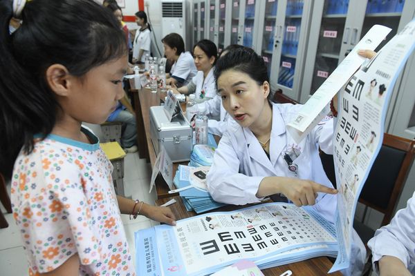 2024年9月20日,安徽省阜阳市妇女儿童医院眼科的医生在本市颍州区王店镇中心学校为学生检查视力。