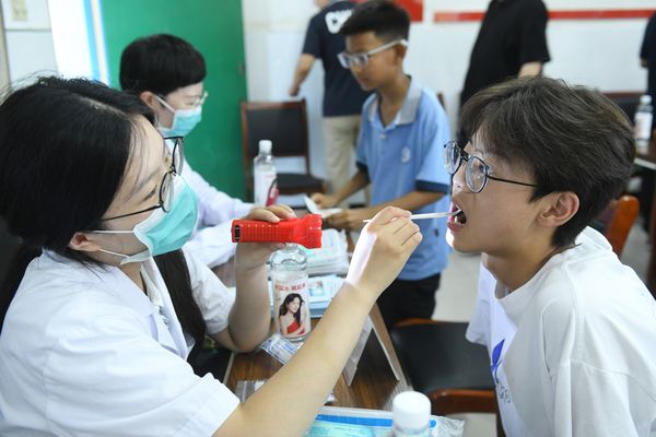 2024年9月20日,安徽省阜阳市妇女儿童医院口腔科的医生在本市颍州区王店镇中心学校为学生检查牙齿。