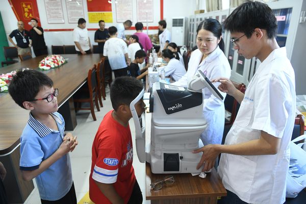 2024年9月20日,安徽省阜阳市妇女儿童医院眼科的医生在本市颍州区王店镇中心学校利用医疗仪器为学生检查视力。