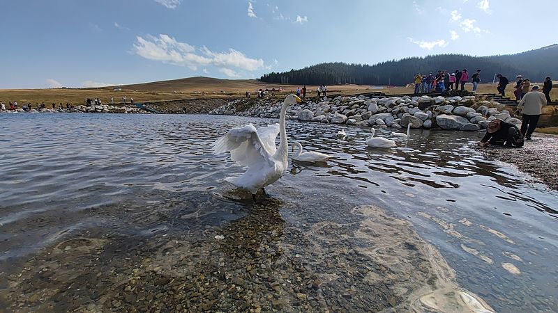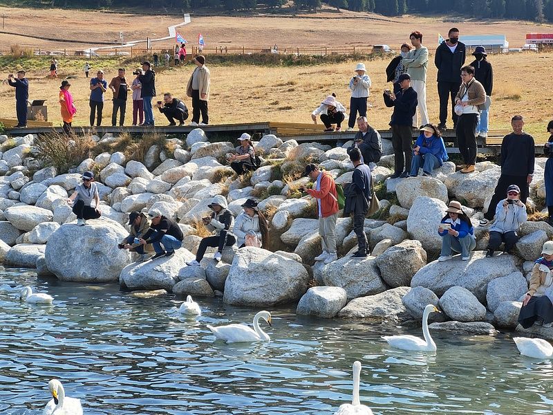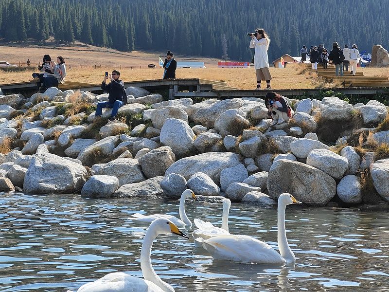 2024年9月21日,新疆赛里木湖湖面波光粼粼,天鹅悠然游弋,秋日风光吸引游客驻足欣赏、拍照打卡。赛里木湖被誉为“大西洋的最后一滴眼泪”,以其清澈的湖水和四周壮丽的雪山草原而闻名遐迩。 中新社记者 王小军 摄