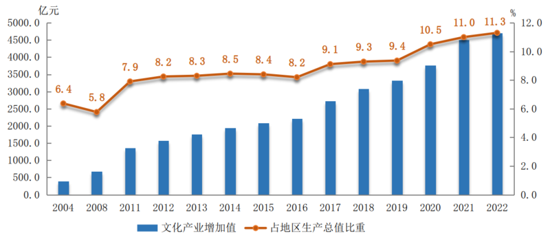 从全国文化中心建设看,新中国成立以来,文化中心一直是重要的首都功能,北京始终坚持首善标准、发扬首创精神,在文化建设上服务全国、引领全国。2022年全市文化产业增加值4700.3亿元,占全市地区生产总值的比重为11.3%,保持全国首位,比2004年提高4.9个百分点。2023年人均公共文化服务设施建筑面积0.41平方米,是2015年的近3倍;历史文化街区占核心区总面积的比重达到25.6%,比2015年提高3.6个百分点。