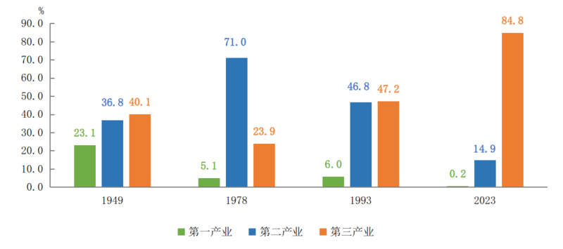 产业发展向新提质。新中国成立初期,北京产业发展呈低水平的“三二一”发展格局,三次产业比例为23.1∶36.8∶40.1;上世纪50年代以后,在建设现代化工业基地背景下,第二产业成为经济发展的主导产业,1954年第二产业比重为44.1%,首次超过第三产业,1978年达到71%;上世纪80年代以来,按照中央指示精神同时结合首都特点,北京开始调整产业结构,大力发展第三产业,1993年第三产业占比再次超过第二产业,达到47.2%并逐步提高,“三二一”的产业结构基本确立;2015年以后三产比重稳定在八成以上,2023年北京三次产业结构为0.2∶14.9∶84.8。产业发展呈现高端化特征。农业由传统种植业向现代农业、由重生产功能向重生态功能转变,传统种植业占比从1970年的71.2%下降到2023年的53.7%,体现生态功能的林业产值占比提高至26.1%。工业由劳动密集型向资本技术密集型转变,以电子信息、汽车、生物医药为主的先进制造业取代化工、冶金等传统重工业,2023年电力、汽车、电子、医药行业产值合计占比接近七成。服务业结构逐步优化,批发和零售业,交通运输、仓储和邮政业等传统服务业占比由新中国成立之初及改革开放初期的一半以上,下降到2023年的11.1%;金融业,信息传输、软件和信息技术服务业,科学研究和技术服务业,租赁和商务服务业增加值占服务业的比重达到63.3%,比2001年提高22.1个百分点。新兴产业加快成长,2023年战略性新兴产业、高技术产业增加值占GDP的比重分别为23.9%和27.1%,比2016年分别提高3个和5.3个百分点。