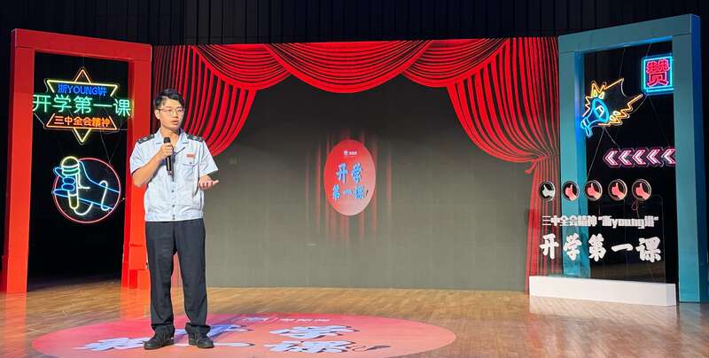 9名青年宣讲员用“开放麦”的形式,围绕党的二十届三中全会精神,向大学生讲述了新学期特别的第一课。基层干部张博文带来了节目《<之江新语>治愈了我的精神内耗》。节目中讲述了他为了推进基层工作,加入广场舞团演唱凤凰传奇乐队歌曲的真实故事。在欢声笑语中,向观众传递了扎根基层一线、不畏困难的精神。