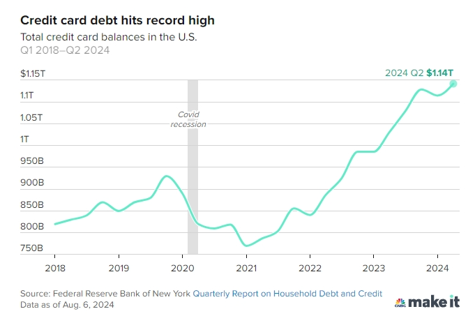 2018年一季度至2024年二季度,美国信用卡债务总额创下历史新高。(CNBC截图)