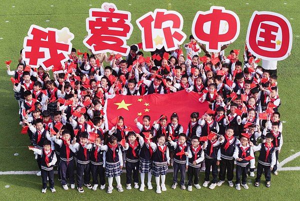 2024年9月27日,江苏淮安,生态文旅区沁春路小学的学生们举起国旗,喜迎国庆节。