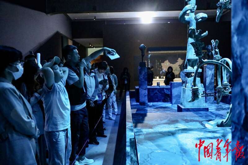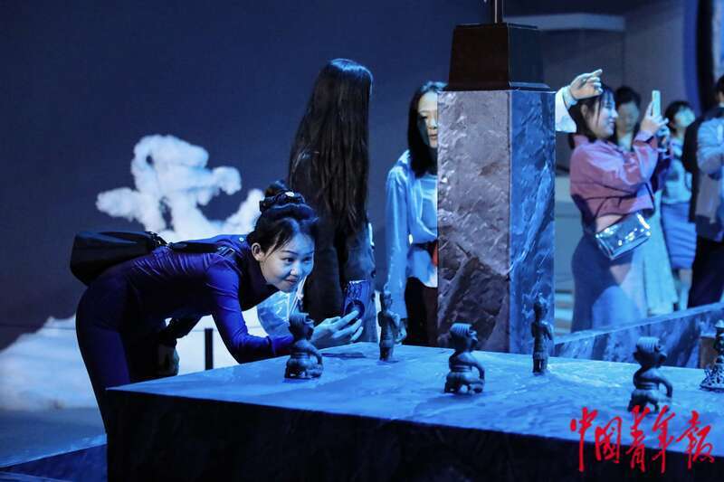 9月28日,北京民生美术馆,讲解员在三星堆祭祀场景复原现场为参观者们讲解三星堆文化的相关知识。中青报·中青网记者 孔斯琪/摄