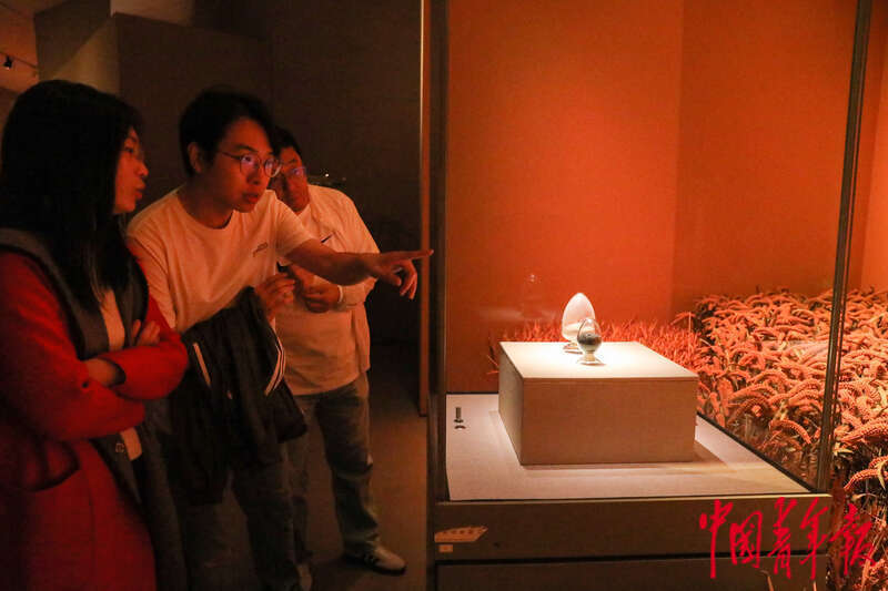 9月28日,北京民生美术馆,参观者在观看距今4000年前新石器时代的炭化稻谷和粟。中青报·中青网记者 孔斯琪/摄