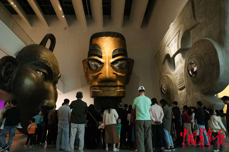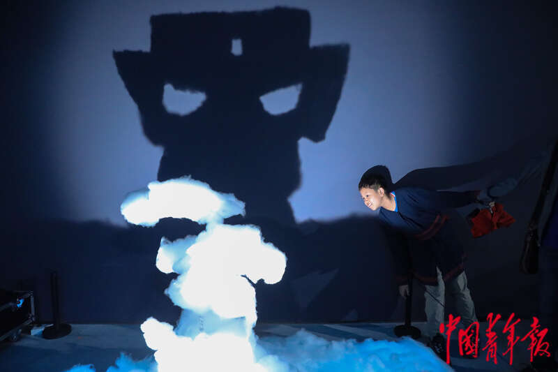 9月28日,北京民生美术馆,一名小观众好奇地望向展厅中以三星堆出土文物为灵感制作的艺术装置。除了重量级的文物展品,现场还有多组大型艺术装置和复原模型,为参观者带来沉浸式观展体验。中青报·中青网记者 孔斯琪/摄