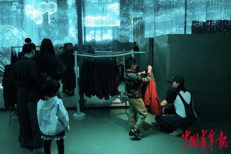 9月28日,北京民生美术馆,一名小观众在试穿通过文物资料模拟复原出的古蜀服饰。中青报·中青网记者 孔斯琪/摄