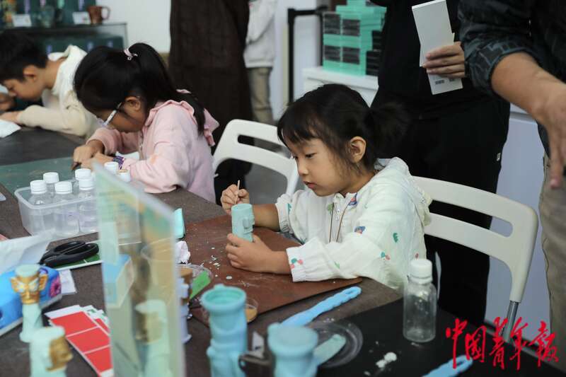 9月28日,北京民生美术馆,一名小观众在体验制作三星堆“同款”戴金面罩青铜人头像。中青报·中青网记者 孔斯琪/摄